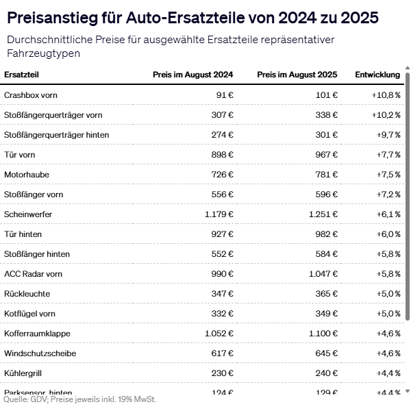 Autohersteller haben bei sichtbaren Ersatzteilen wie Scheinwerfern, Rückleuchten oder Kofferraumklappen praktisch ein Monopol – freie Konkurrenz gibt es kaum. Für Verbraucher bedeutet das stark steigende Preise. Laut GDV-Auswertung sind die Kosten zwischen August 2023 und August 2024 im Schnitt um 6,2 Prozent gestiegen, bei Kühlergrills sogar um mehr als 10 Prozent.